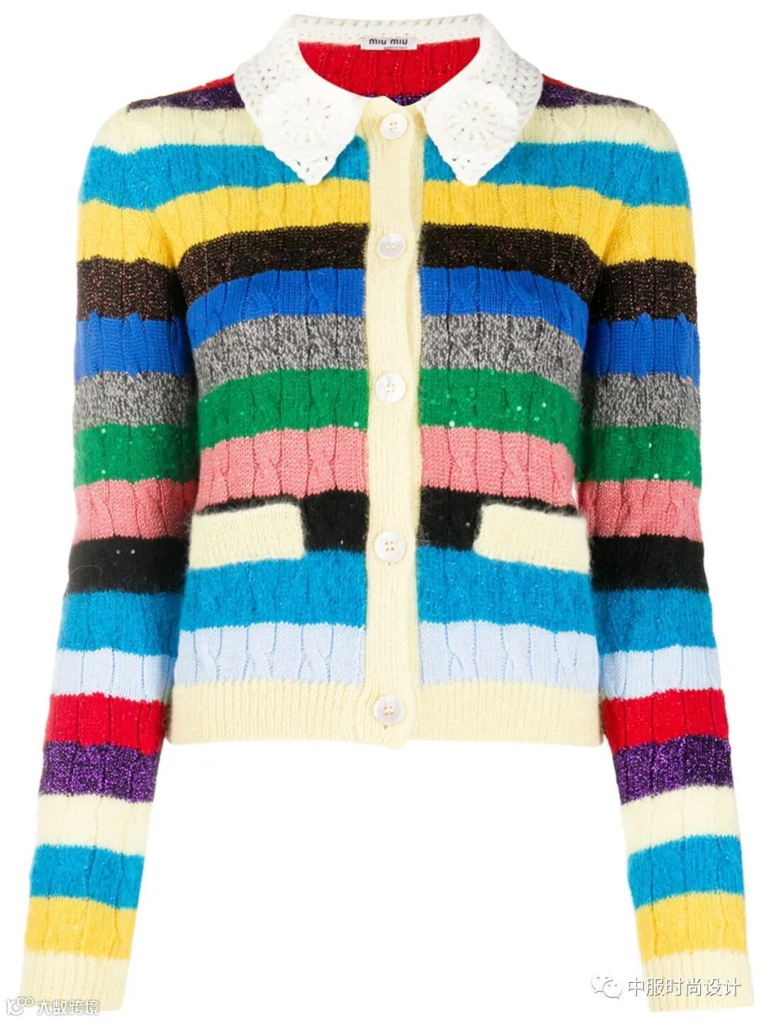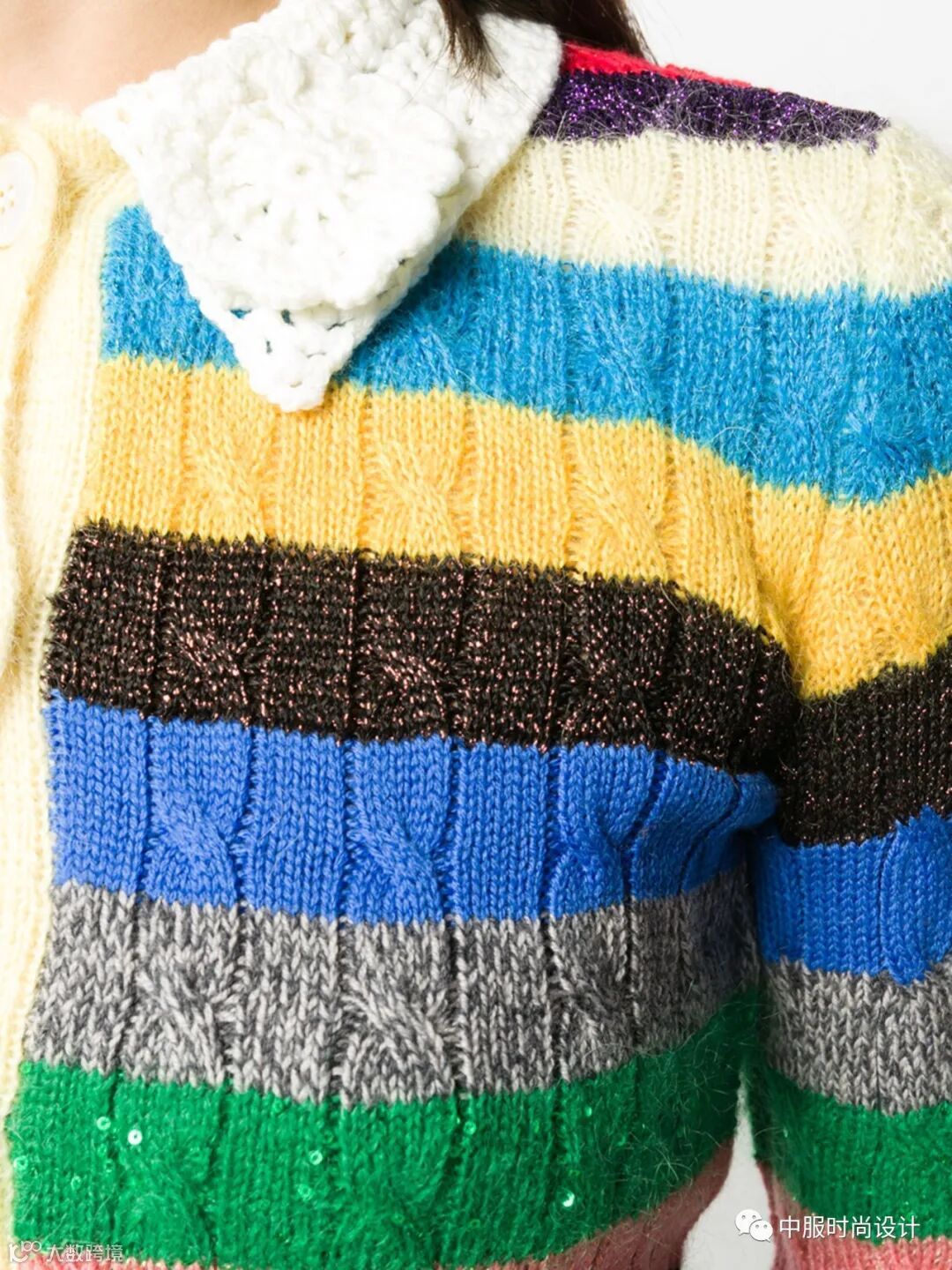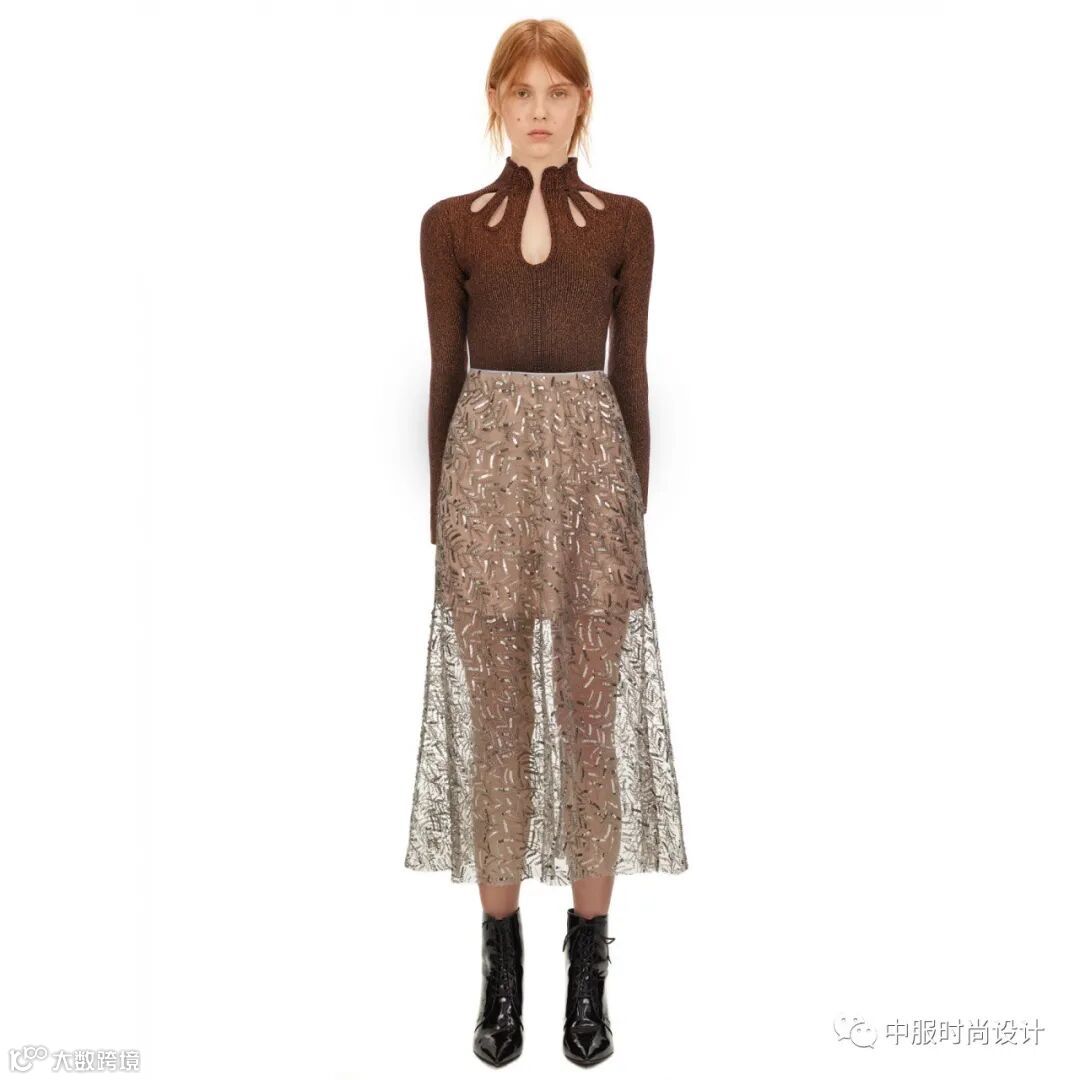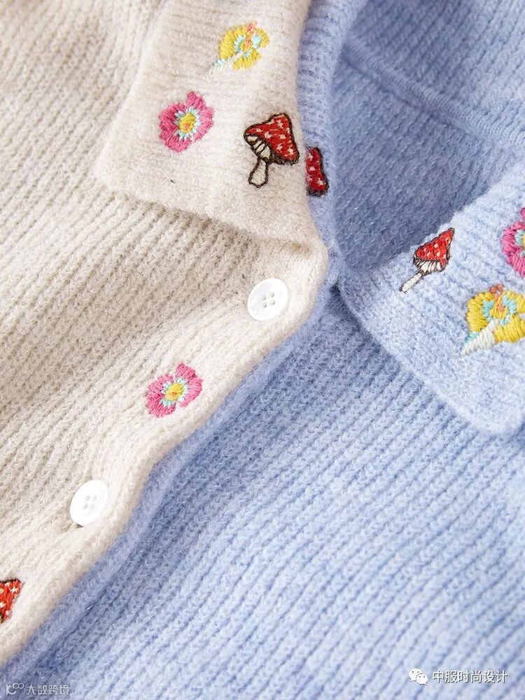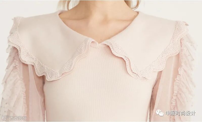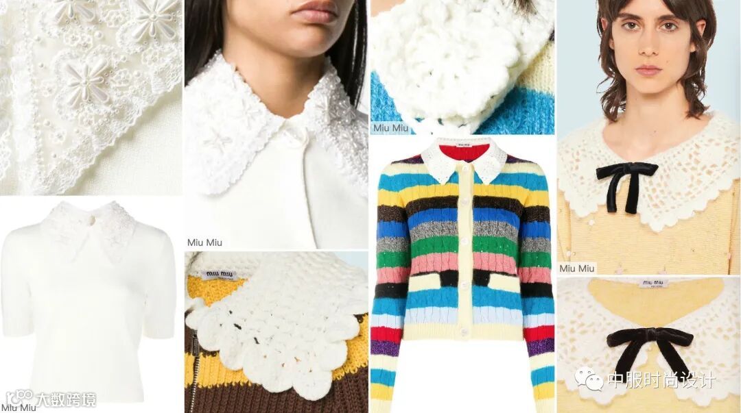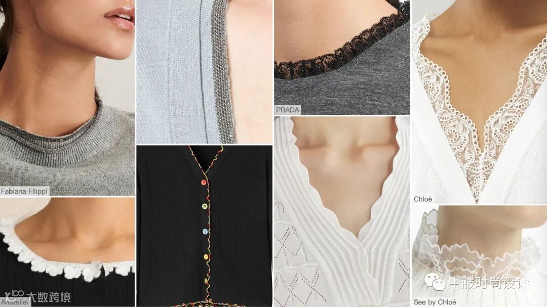 领部细节设计越来越细腻,衣领局部的叠加搭配细小的钉珠装饰,针法变化呈现出层叠的领部肌理,轻薄蕾丝织片在毛衫领部的设计,五彩线条在领口的点缀这些细节的变化使领部更加精致。