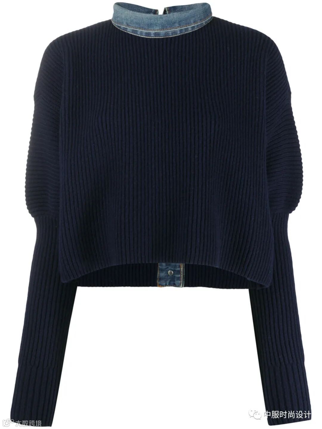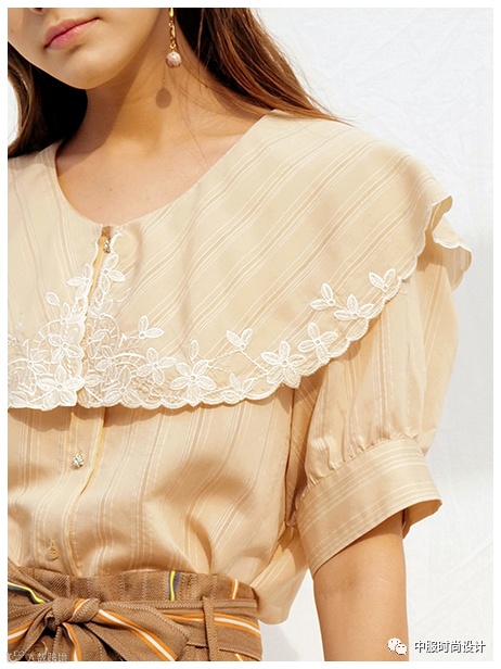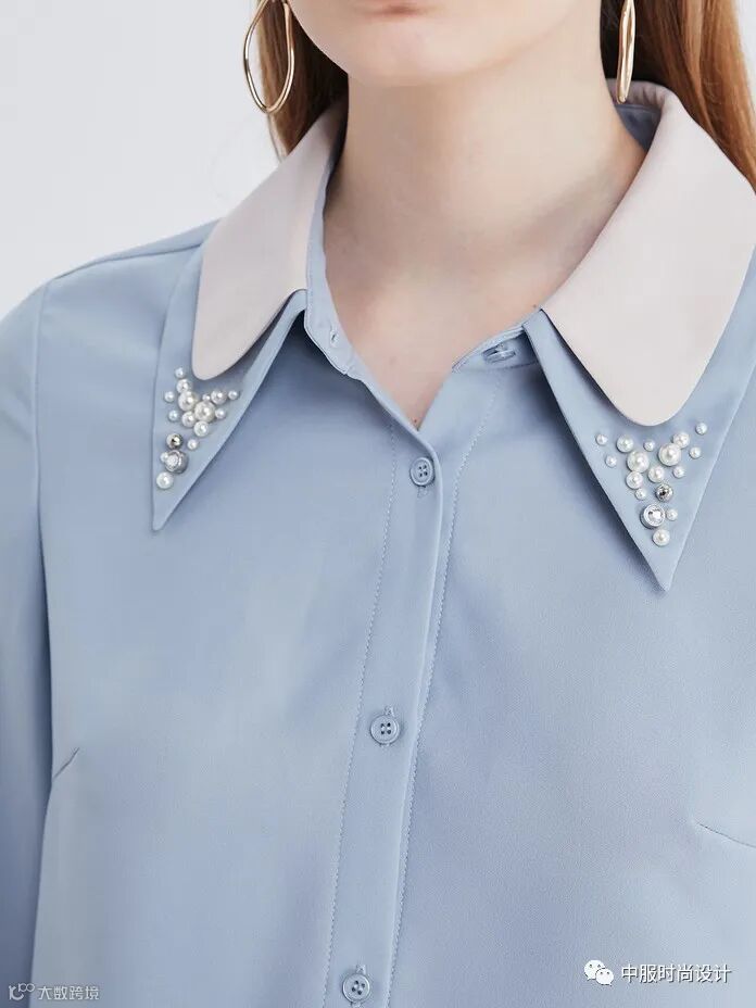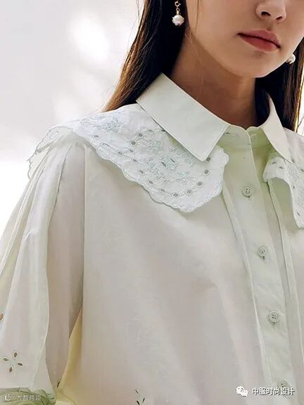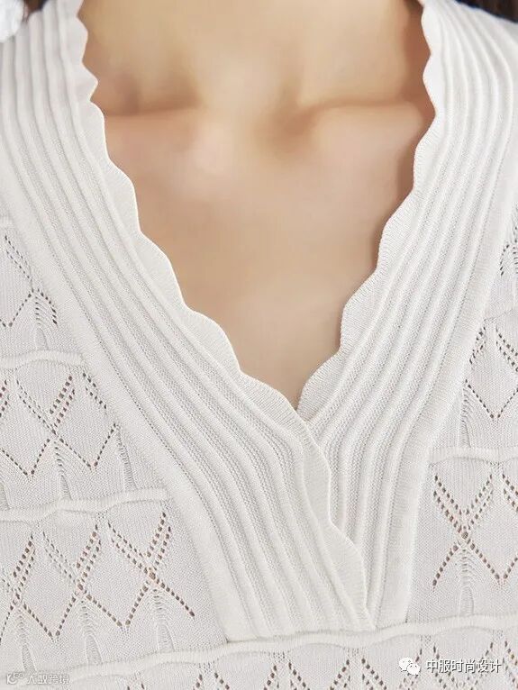 毛衫领部设计亦可在成衣款式的领部设计上寻找灵感,犹如浪花般层层叠叠的领部设计也可延伸运用在毛衫领部设计之中。相同领型的叠加、衬衫领与娃娃领的组合、Polo领尖领与圆领的对比、针织领片与衬衫领片不同质感的层搭设计使毛衫领部细节设计更加新颖。