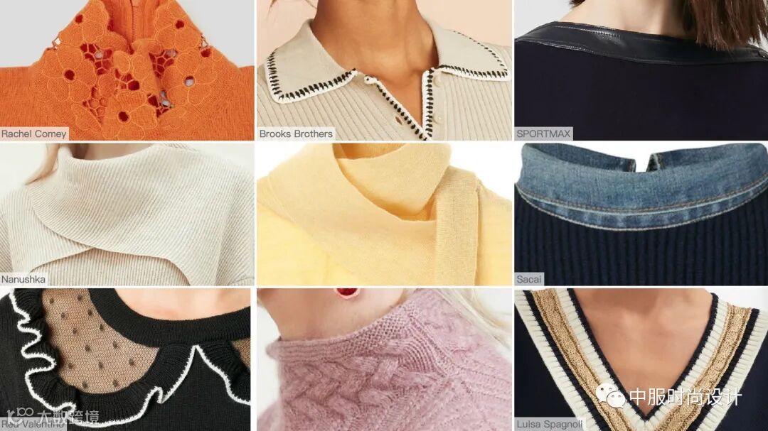除上述领型之外,机绣花朵的高领设计,手缝线迹的Polo领边,百褶波浪的领边、透明丝在领部的运用、细腻绞花在领部的装点、柔软温暖的围巾领型,这些设计都给毛衫款式带来更加精致丰富的设计变化。