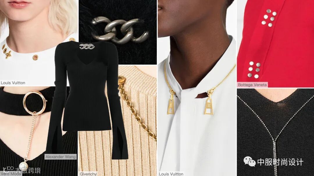 金属因其独特的光泽与质感一直是每一季毛衫设计的重要辅料。新季不论是作为领边的装饰还是领部的连接,对金属质感和工艺运用都更加精致考究。将金属拉链与衣领结合形成独特的装饰效果打造轻奢感,使衣领更加吸睛。