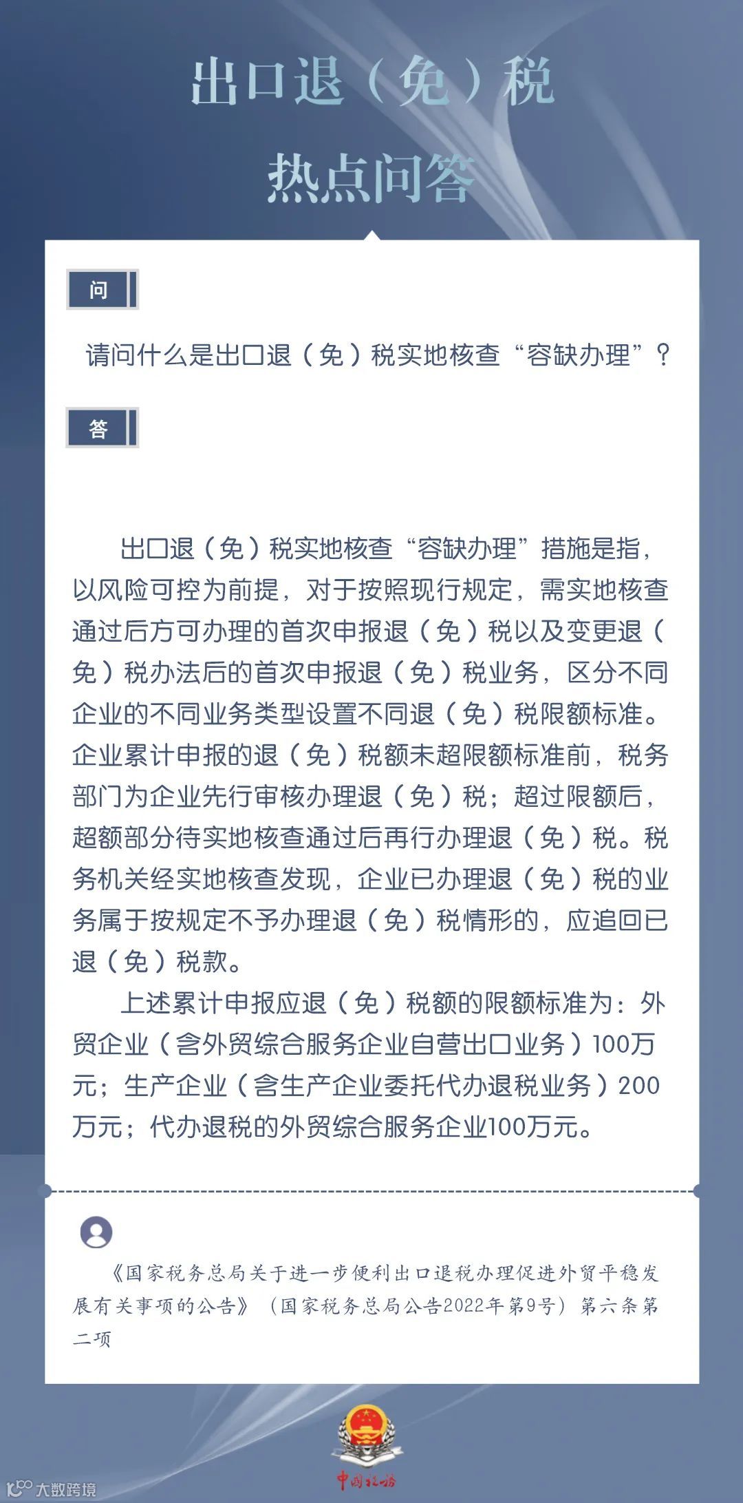 为进一步加力支持包括中小微企业在内的广大经营主体开展外贸出口业务,便于企业掌握出口退税现行规定、及时了解出口退税便利化举措,商务部、国家税务总局针对企业普遍关心的出口退税热点问题,整理了问答集锦。我们将陆续发布热点问答相关内容,今天发布:请问什么是出口退(免)税实地核查“容缺办理”?