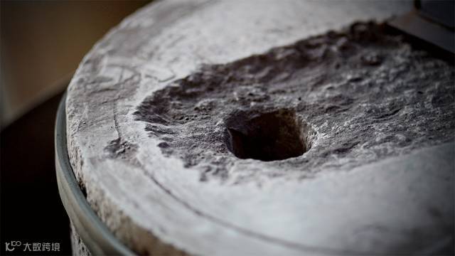 将筛选过后的紫砂颗粒进行石磨碾磨,使石块变成石粉。