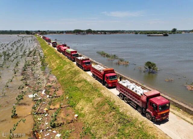 (7月6日12时许,华容县团洲垸洞庭湖一线堤防,装满石块的车辆在决口附近排队。湖南日报全媒体记者 郭立亮 摄)