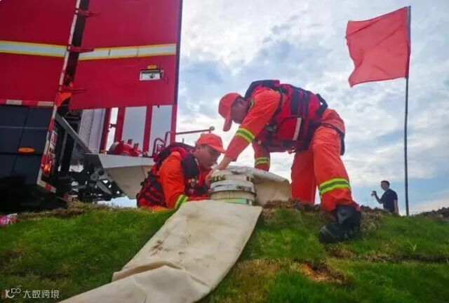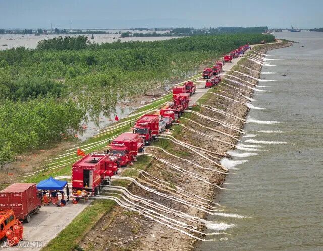 (7月9日,华容县洞庭湖一线堤坝,湖南消防救援队伍等排涝专业队在进行抽排积水作业。国家消防救援局调派湖北、重庆、贵州等地消防救援力量实施跨省区增援助力排涝。湖南日报全媒体记者 郭立亮 见习记者 童臻熙 摄)