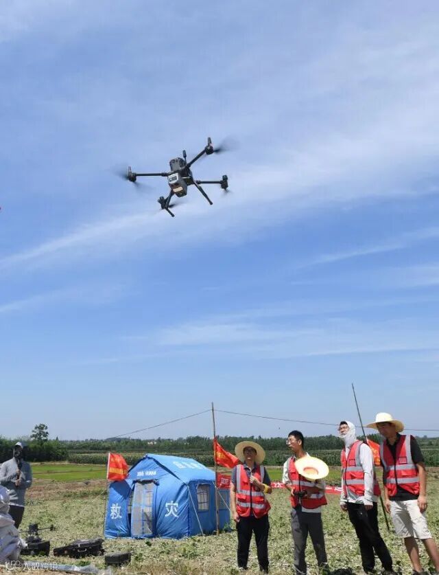 (7月7日,华容县钱团间堤上,应急管理部国家自然灾害防治研究院洞庭湖堤防应急智巡先锋队利用多种先进技术装备进行巡堤查险,实现对管涌、渗漏等堤防险情全方位、立体式巡测。湖南日报全媒体记者 田超 摄)