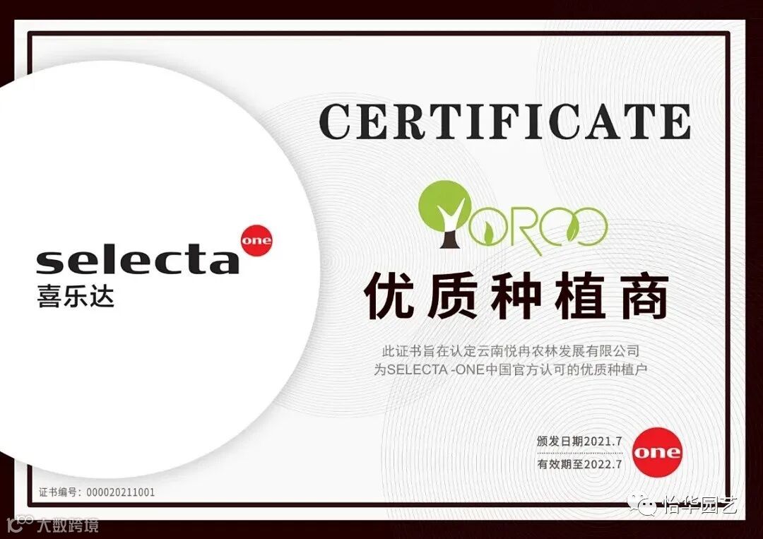 悦冉更也获得了育种商Selecta(喜乐达)颁发的优质种植商证书!