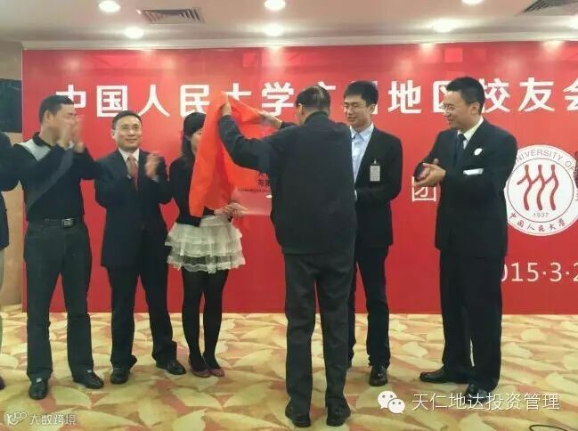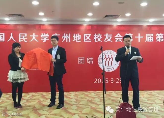 2015年3月29日的广州羊城,春风和煦,木棉盛开,中国人民大学广州地区校友总会第十届第二次会员大会在广东大厦二楼宴会厅如期举行。广州天仁地达投资管理有限责任公司也在这次校友大会上由广州地区校友总会会长、原广东省委常委兼宣传部长、原省政协副主席兼党组副书记黄浩校友亲自揭牌。