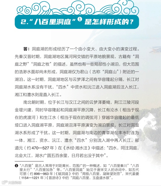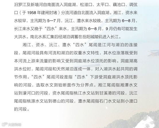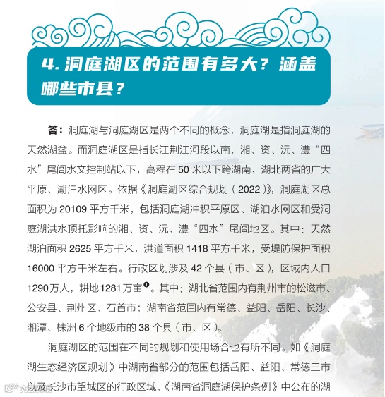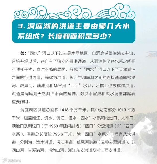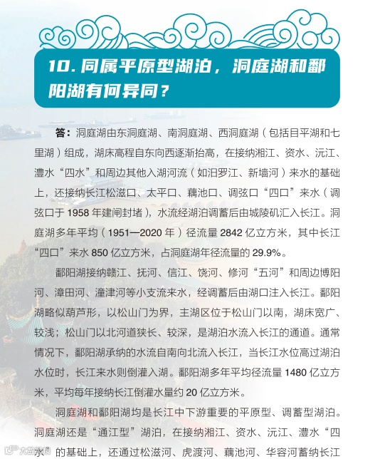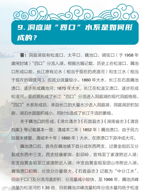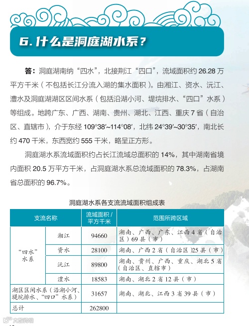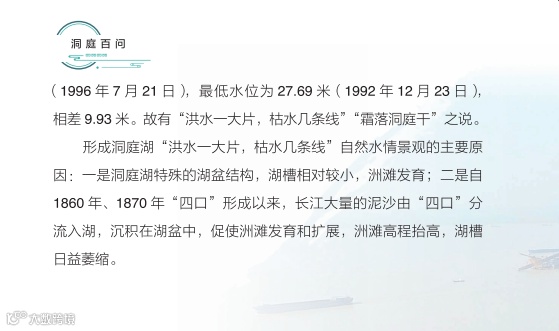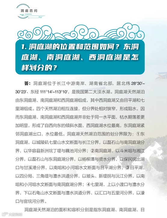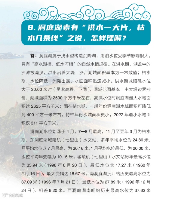 日前,湖南省水利厅主编的《洞庭百问》由中国水利水电出版社正式出版发行。《洞庭百问》全书分为九个部分,共有100道问答题,采用一问一答的形式,系统介绍了洞庭湖基本情况、水系、社会经济、洪水特性、江湖关系、防汛抢险、水利工程、生态环境、历史文化、洞庭湖治理的主要成就和重大事件,以及洞庭湖保护与治理的基本思路等内容。