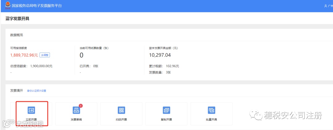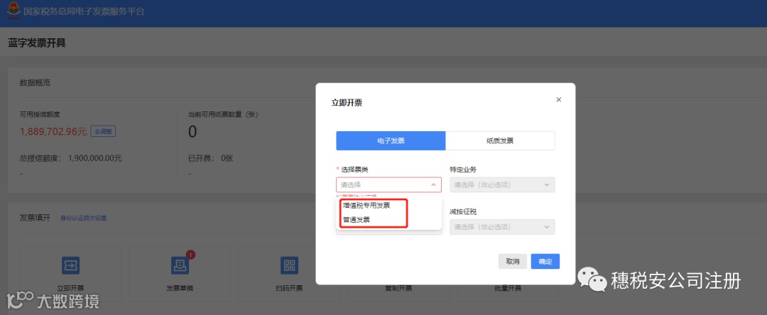 点击【蓝字发票开具]--【立即开票】进入开票功能。选择要开具发票的票种(专用发票/普通发票),如您有差额征税等情况,请据实选择。设置后,点击【确定】。