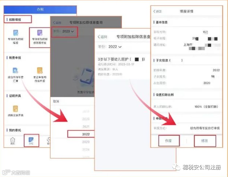 八、如发现需要修改已填报的专项附加扣除项,修改路径为个税APP-“办税”-“扣除填报”“专项附加扣除修改和作废”,选择2022年度,进入需要修改项目的填报详情。