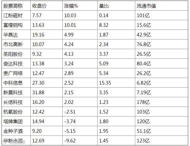 富煌钢构(13.630, 1.24, 10.01%):联合河北建工集团开拓雄安业务,两连板。