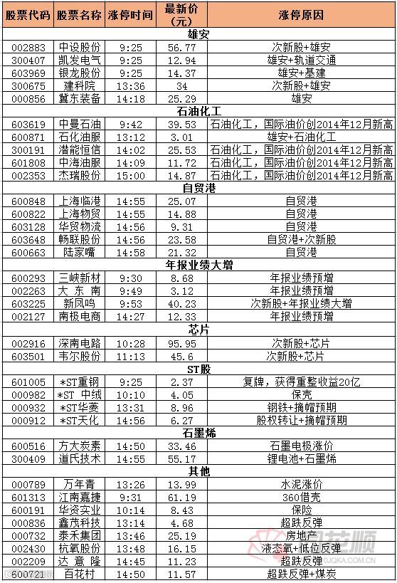 盘面上,油气改革板块早盘走强,石化油服(600871)领涨,贵州茅台(600519)创历史新高带动白酒股反弹,雄安概念高潮次日大幅分化,早盘中设股份(002883),凯发电气(300407)继续一字板涨停,午后建科院(300675)和冀东装备(000856)相继回封,其余跟风股走弱,深南电路(002916)复牌后再度涨停,带动次新股和芯片板块反弹,江南嘉捷(601313)3连板,石墨电极价格近期连续上涨,方大炭素(600516)引领石墨烯板块反弹。韦尔股份(603501)封板,带动芯片概念股大涨。午后万年青(000789)大幅拉升至涨停,带动周期股大涨,钢铁板块在三钢闽光(002110)封板的带动下大幅反弹。中国石化大幅拉升,带动油气改革板块走强。石墨烯,稀土永磁,电解铝等周期股轮动走强。常熟银行(601128)封板,带动次新银行股反弹。尾盘上海物贸(600822)带动上海自贸港概念大涨。