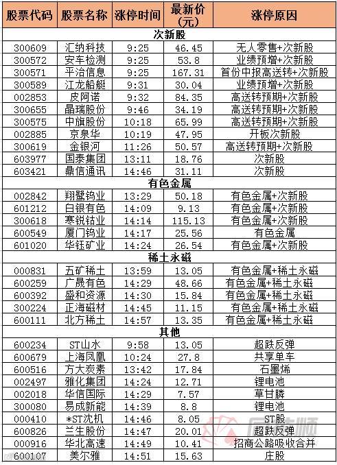 盘面上,昨日涨停的开立医疗冲高回落,复牌股华北高速多次封板未遂,但并未影响市场人气,受到第一家中报高送转股平治信息一字板的影响,早盘次新股再度爆发高潮,汇纳科技,安车检测,江龙船艇封死一字板,皮阿诺,中旗股份跟风涨停。微信小程序概念股在信雅达强势涨停带动下,大幅反弹,新国都冲击涨停被砸开后,多数跟风股冲高回落。小盘的雄安股科林电气涨停,带动雄安板块再度反抽,阿里巴巴领投ofo的消息刺激共享单车板块走强,上海凤凰封板。有色金属板块午后迎来爆发,翔鹭钨业涨停后,五矿稀土,厦门钨业等一批有色股跟风涨停,方大炭素涨停后,带动石墨烯板块爆发,雅化集团封板带动了锂电池板块大幅反弹。山煤国际大幅冲高,带动煤炭股走强。龙蟒佰利冲击涨停,带动钛白粉板块大涨。临近尾盘山西证券冲击涨停,带动证券股拉升。华北高速尾盘再度封板,总体8个涨停。