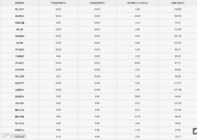 一字板:金隅股份、冀东水泥、冀东装备、京汉股份、唐山港、巨力索具、中化岩土、韩建河山