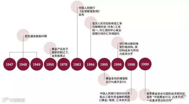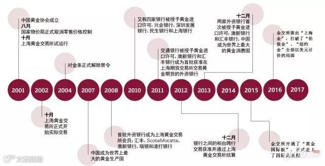 上海黄金交易所于2002年10月开始交易。2003年,金银制品运作业务许可证制度被废除, 2004年,自1950年以来第一次允许私人拥有和交易金条,这些都进一步实现了黄金的自由化。2000年以后的十多年中,中国对黄金的需求增长迅猛,投资黄金的热潮也持续高涨。