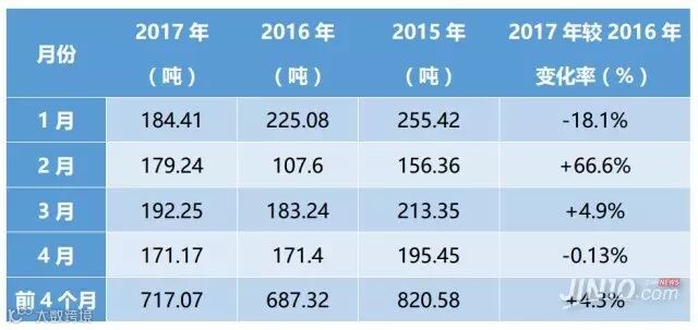 上海黄金交易所(SGE)今年最新公布数据显示,今年1-4月现货黄金提货量环比增长了近13%,仅次于2015年金交所同期历史最高纪录。分析师通常用SGE的黄金提取量,估算中国现货黄金需求。数据显示,中国黄金进口累计总量,加上中国本身的黄金产量,再加上回收黄金量,更接近从SGE的黄金提货量。官方报告中的累计数字没有剔除季节因素(2月春节因素)。今年1-4月SGE累计黄金提取量高达717.07吨,比去年同期上涨4.3%。