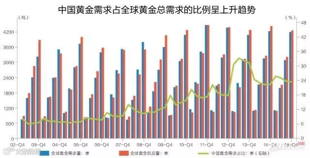 伴随着国内黄金产量高企的是中国强劲的黄金需求。从近十几年的统计来看,中国黄金的需求占全球黄金需求的比例整体呈上升趋势,仅在2013-2014年出现较大的波动。