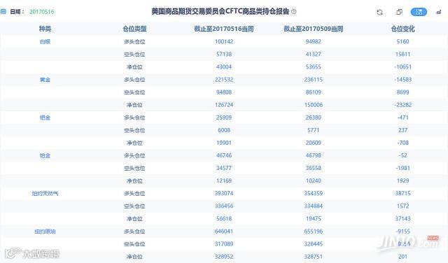 此外,美国商品期货交易委员会(CFTC)公布的最新周报显示,截至5月16日当周,COMEX黄金净多仓大减23282手至126724手,其中多头仓位减少14583手,空头仓位增加8699手;而当周白银净多仓也减少10651手至43004手,其中多头仓位增加5160手,空头仓位增加15811手。