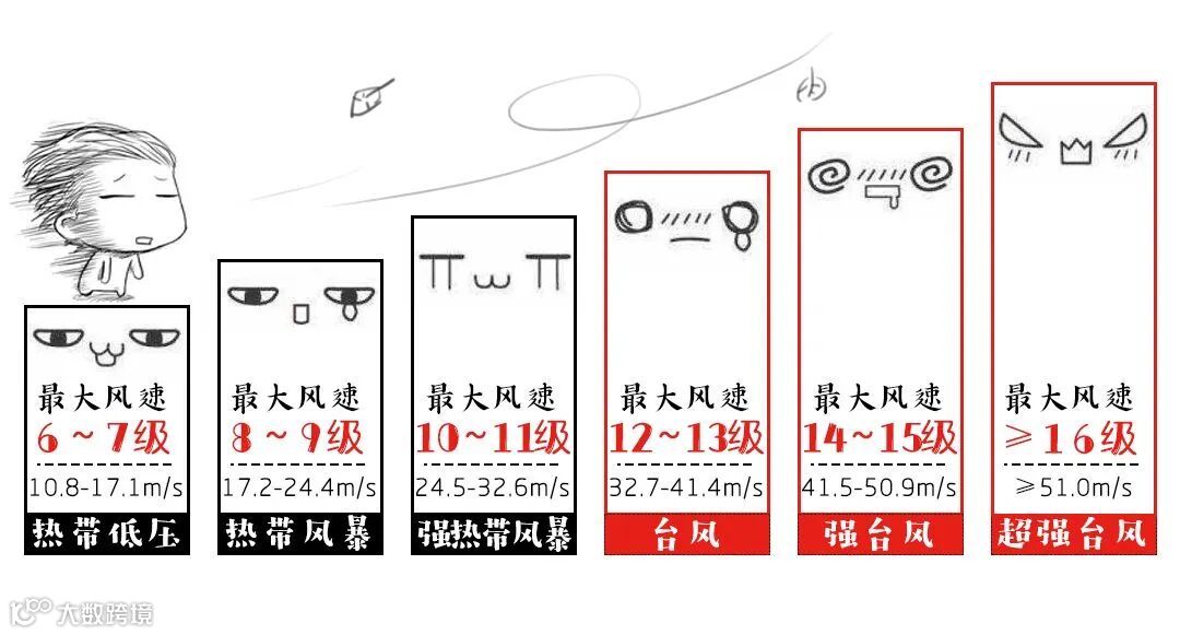 国家《热带气旋等级》(GB/T 19201—2006)标准规定,热带气旋按其底层中心附近最大平均风速划分为热带低压、热带风暴、强热带风暴、台风、强台风、超强台风6个等级。