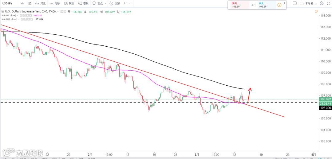 策略分析:4H级别突破下降趋势线并完成2次回踩,多空转换完成原则上逢低布局多单,支撑106.4区域。