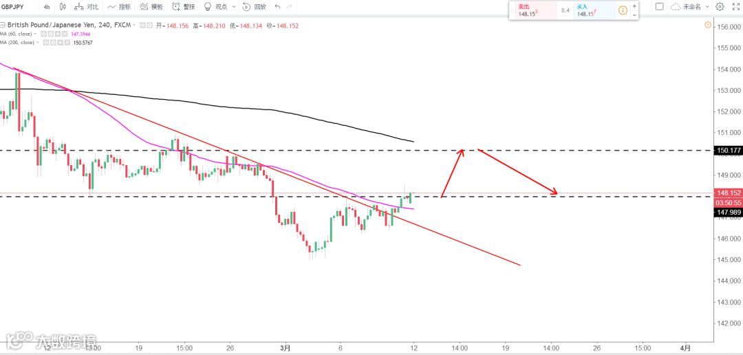 策略分析:4H级别开始突破短期下行趋势线,短线风头转变,上方压力150支撑148区域。策略:观望。(谨慎操作,请设置好止损线!)