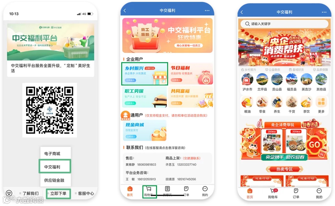 关注“交建云商平台”微信公众号,点击菜单栏“立即下单-中交福利-乡村振兴”。