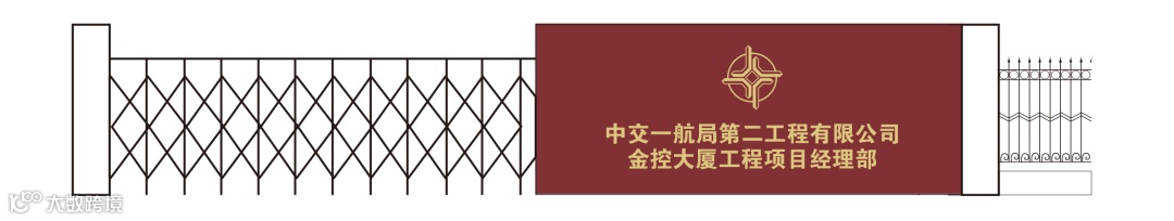 项目部大门与旗台的背景墙均采用枣红色瓷砖或花岗岩材料。
