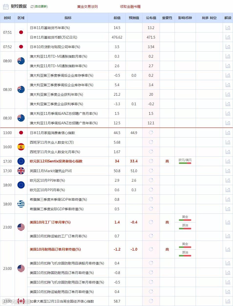 美国时段,投资者需主要关注23:00公布的美国10月耐用品订单月率终值、美国10月工厂订单月率。