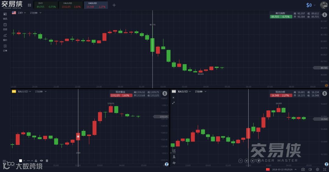 周四 (3月22日)凌晨02:00,美联储联邦公开市场委员会(FOMC)一致决定在3月将联邦基金利率目标区间上调25个基点至1.50%-1.75%,但因美联储内部在今年加息次数上有分歧,决议公布后,美指跌破90关口,现货金银短线急涨,逾30亿美元的买单助推黄金涨超5美元。随后美联储主席鲍威尔的新闻发布会上措辞偏鸽,黄金涨超1%上攻1330美元,白银涨幅扩大至2.5%。