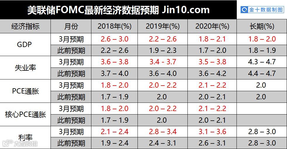 这是2008年金融危机以来第六次加息,也是年内的首次加息。FOMC声明显示,此次加息的决定获得一致通过。与此同时,美联储上调2018-2019年GDP增速预期,下调未来3年失业率预期,维持未来两年PCE通胀预期不变,上调2019-2020年核心PCE通胀预期;预计2019-2020年加息路径更加陡峭,2019年将加息三次,此前预估为两次。