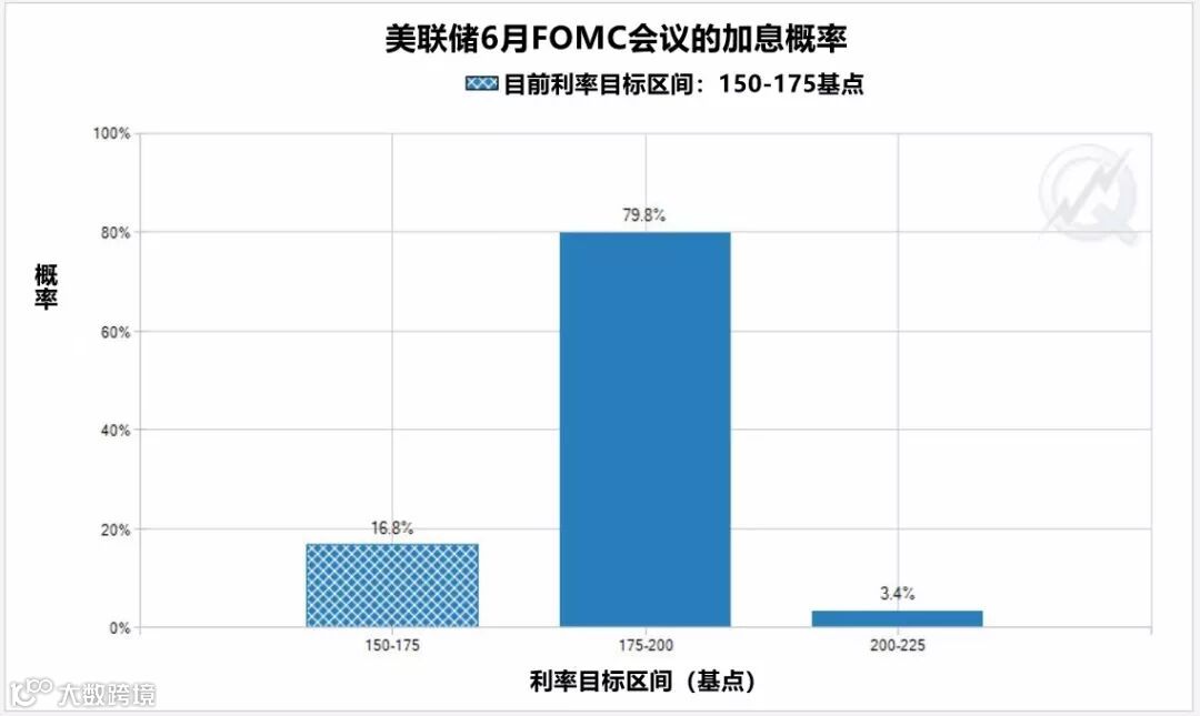 据CME“美联储观察”,目前美联储6月加息25个基点至1.75%-2%区间的概率为79.8%;9月至该区间的概率为36.7%。