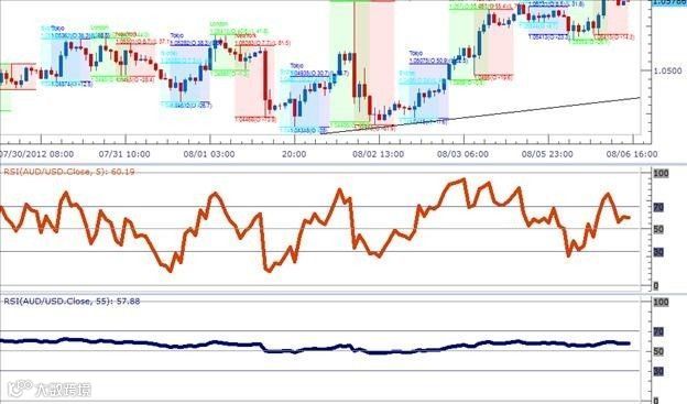 如果设置RSI的周期为5,就会测量当前的价格变动与过去4个周期价格变化的强度(总共5个周期)。如果设置周期为55,则测量当前价格变化与过去54个周期价格变化的强弱。你使用的周期越长,RSI对新的价格变化就越不敏感,即形态越平缓。