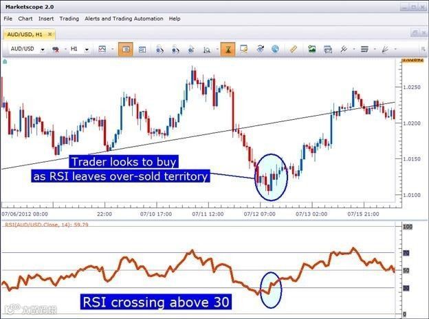 RSI最基本的用法是寻找做多的时机∶由於原先的价格已经达到足够低的水平,因此当RSI反转并向上穿过30时,被看成是价格正在离开超卖范围,此时便是买入的时机。下图描绘了这种情形∶