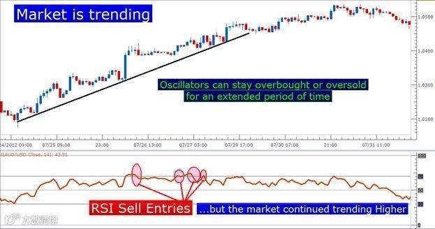 如果市场处於整盘整理中,这个指标可以相当有用,因为投资者可以使用RSI指标寻找入场的机会。但是,如果市场处於趋势中,由於价格逐渐沿著趋势移动,RSI就可能是不准确的,从而令投资者错误建仓,造成亏损。下图描绘了这种情形∶