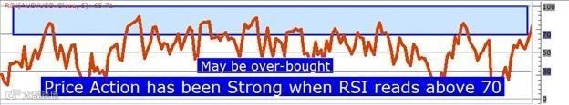 如果RSI的值超过70,则表示价格行为强劲,可能存在超买。