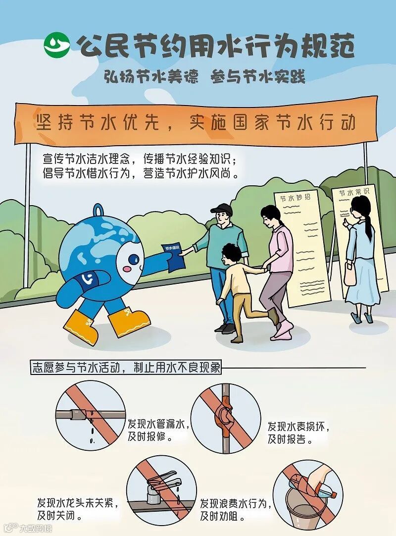 为增强全民节约用水意识,引领公民践行节约用水责任,推动形成节水型生产生活方式,水利部、中央文明办、国家发展改革委、教育部、工业和信息化部、住房城乡建设部、农业农村部、国管局、共青团中央、全国妇联编制了《公民节约用水行为规范》。
