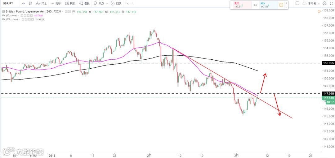 策略分析:关注上方压力148区域即可,有突破趋势线的走势,短线暂时观望,若上破148则会继续向上反弹。