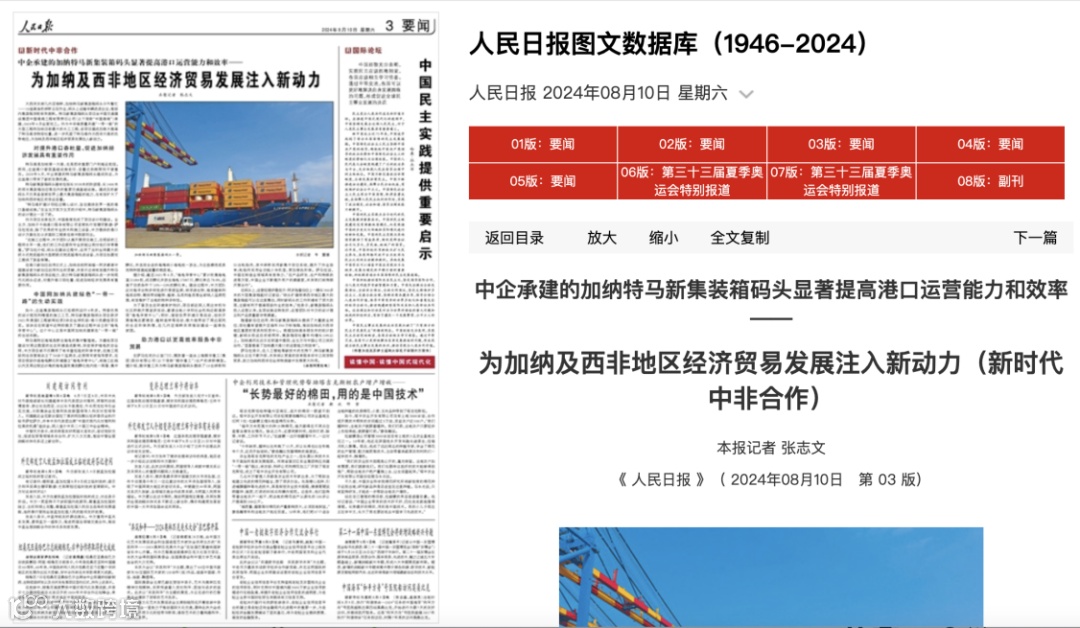 8月10日,人民日报报道称,特马新集装箱码头项目由中国港湾承建,2020年6月全面完工。作为中非高质量共建“一带一路”的大型工程和加纳目前最大的水工工程,该项目建成后极大提高了特马港货物吞吐量,进一步巩固了特马港作为西非大港的优势地位,为加纳及西非地区经济贸易发展注入新动力。