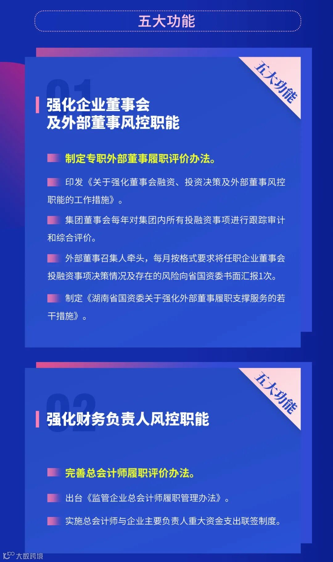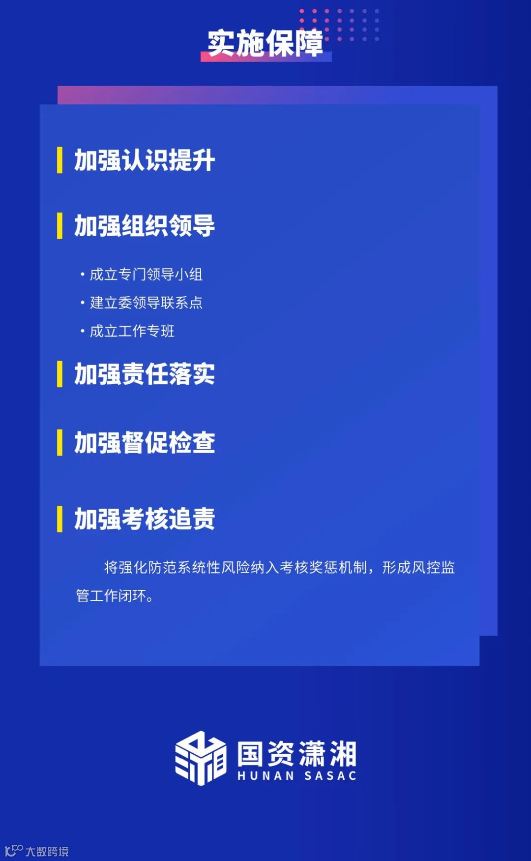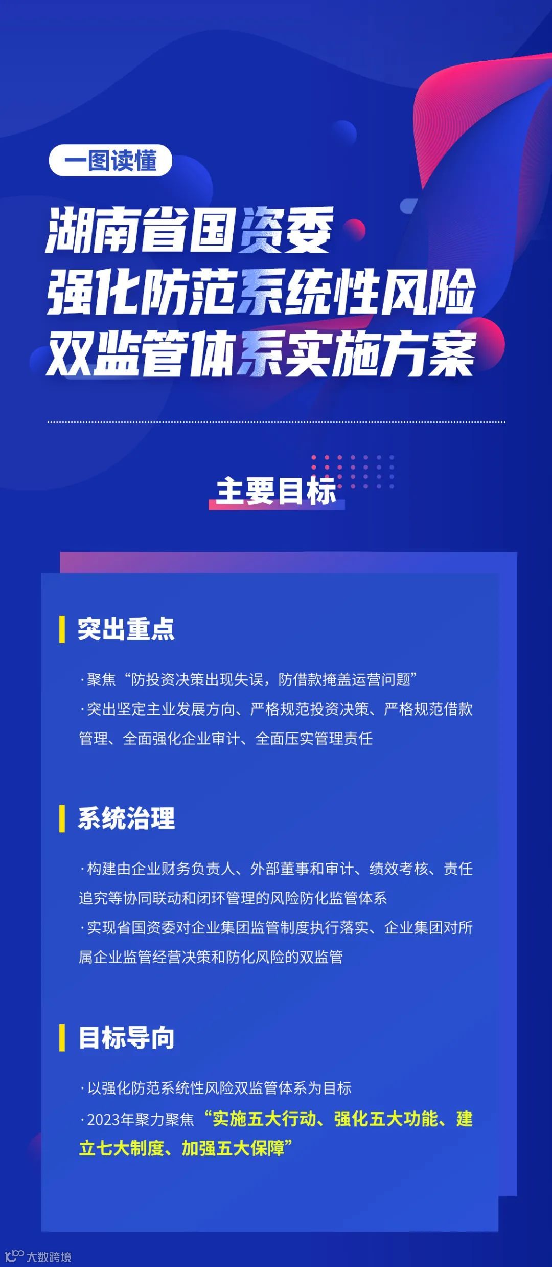 新一轮国企改革深化提升行动将启,“统筹安全与发展”被湖南省国资国企摆在了全局性、战略性地位。近日,湖南省国资委印发《湖南省国资委强化防范系统性风险双监管体系实施方案》(以下简称《方案》),从提升国资监管效能方面,为省属监管企业增强战略预判和风险预警、抓住要害提高风险化解能力、构筑全面风险防控体系等方面搭建高质量发展防护网。《方案》明确了五大行动、五大功能,具体要求有哪些?跟着小编一图看懂→