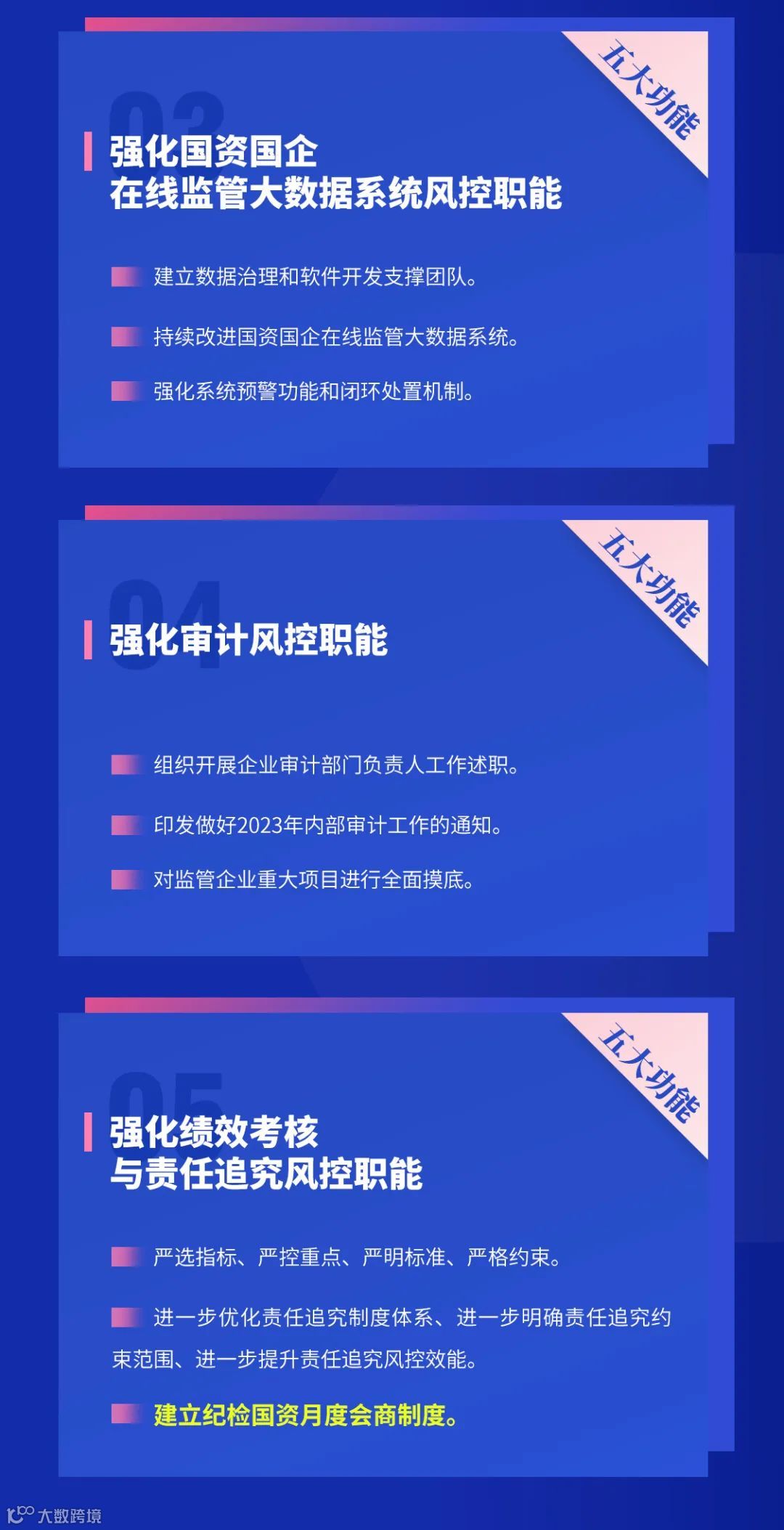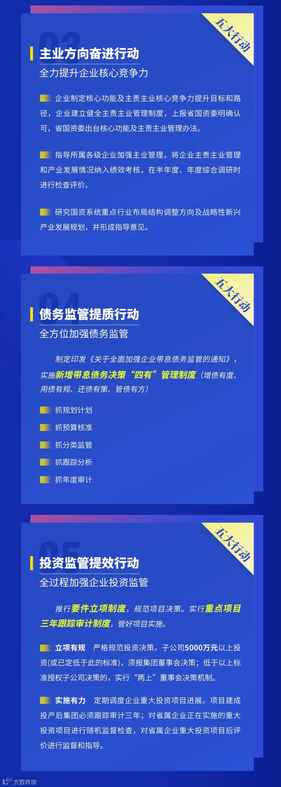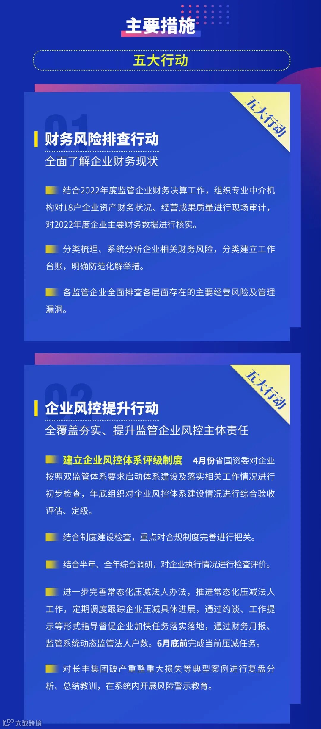 湖南省水利水电设计院有限公司新一轮国企改革深化提升行动将启,“统筹安全与发展”被湖南省国资国企摆在了全局性、战略性地位。近日,湖南省国资委印发《湖南省国资委强化防范系统性风险双监管体系实施方案》(以下简称《方案》),从提升国资监管效能方面,为省属监管企业增强战略预判和风险预警、抓住要害提高风险化解能力、构筑全面风险防控体系等方面搭建高质量发展防护网。《方案》明确了五大行动、五大功能,具体要求有哪些?跟着小编一图看懂→