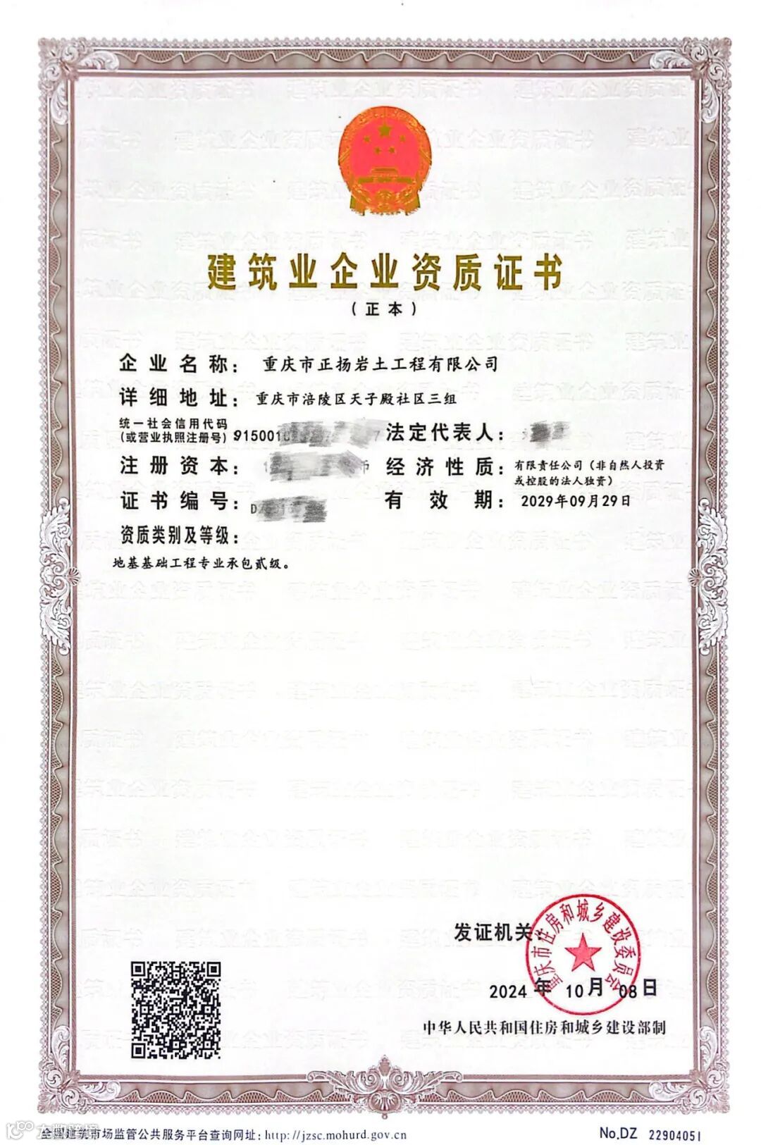 近日,经重庆市住房和城乡建设委员会批准,公司下属全资子公司重庆市正扬岩土工程有限公司(简称:正扬岩土公司)成功取得地基基础工程专业承包贰级资质。