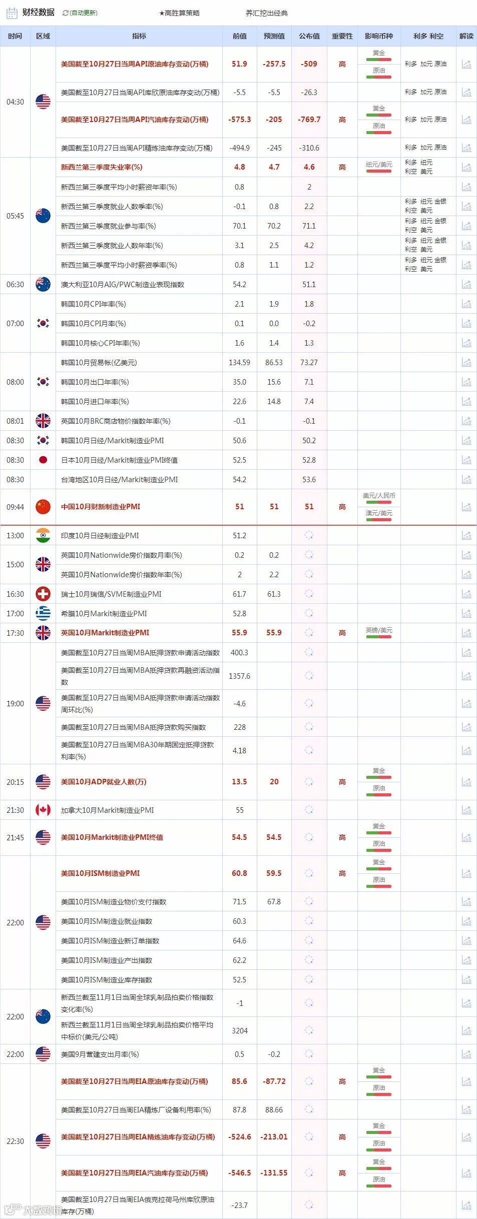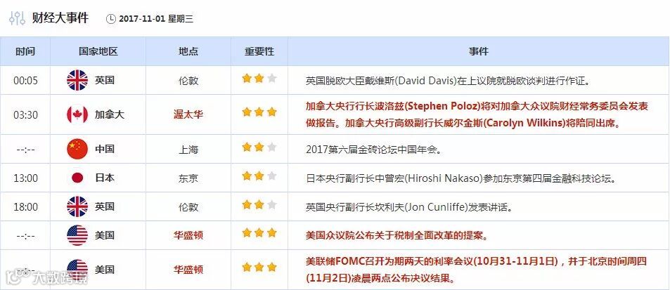 【财经数据】11月1日财经日历
