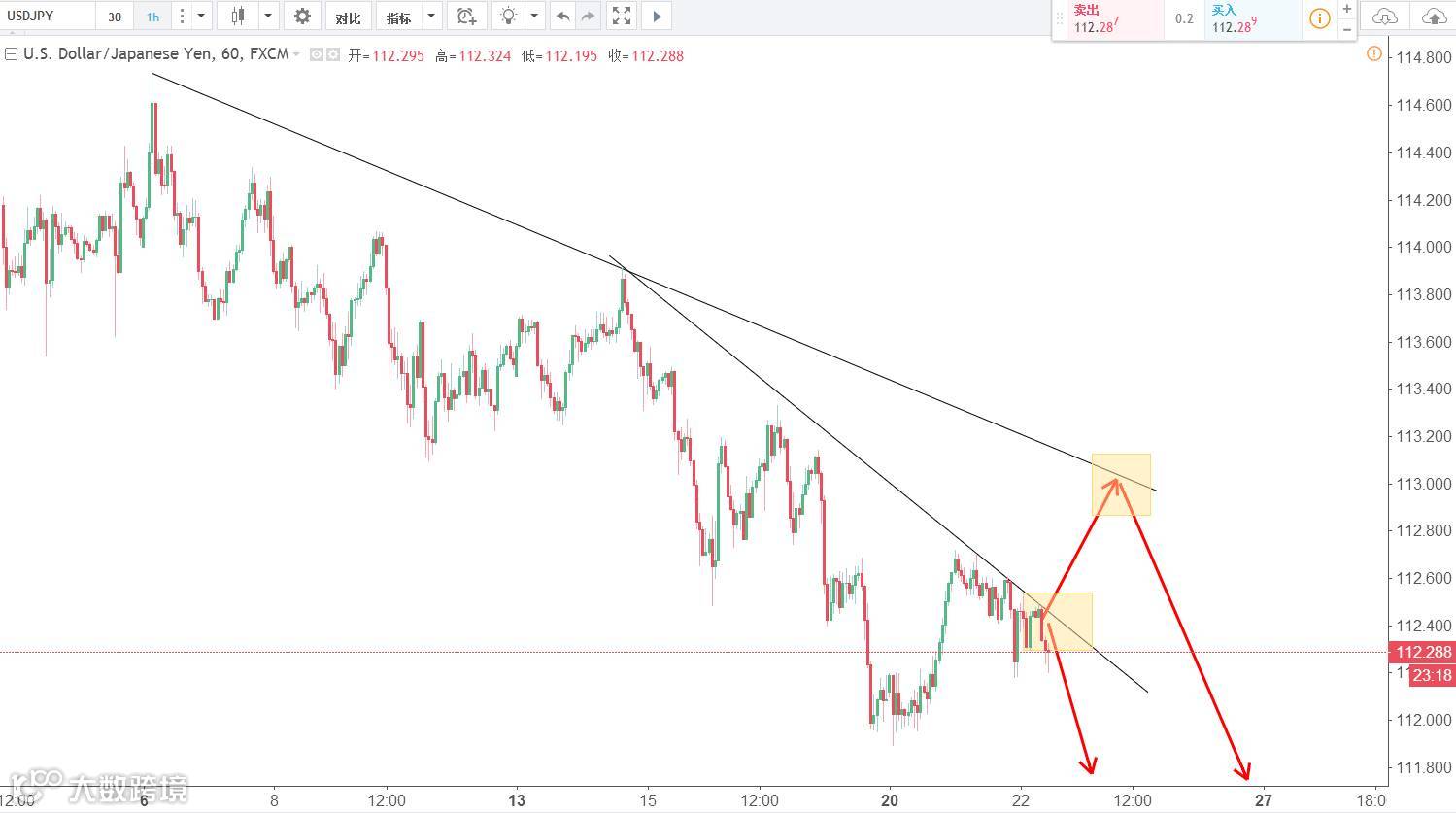 技术点评:1H下降通道,但行情一直小幅震荡延上轨下行,证明市场空头和多头趋势还是势均力敌的。这几天日内短线谨慎操作,日线级别空单为主目标111.7防守位113。