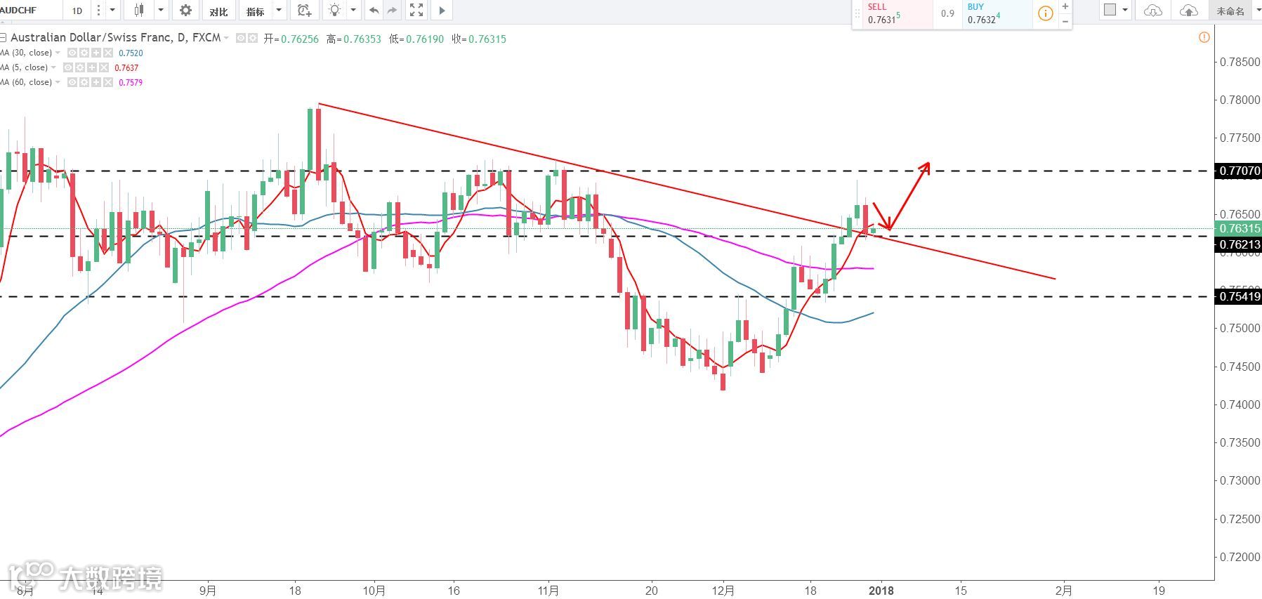 策略:0.7620区域企稳后布局多单,目标看向0.77。(谨慎操作,请设置好止损线!)