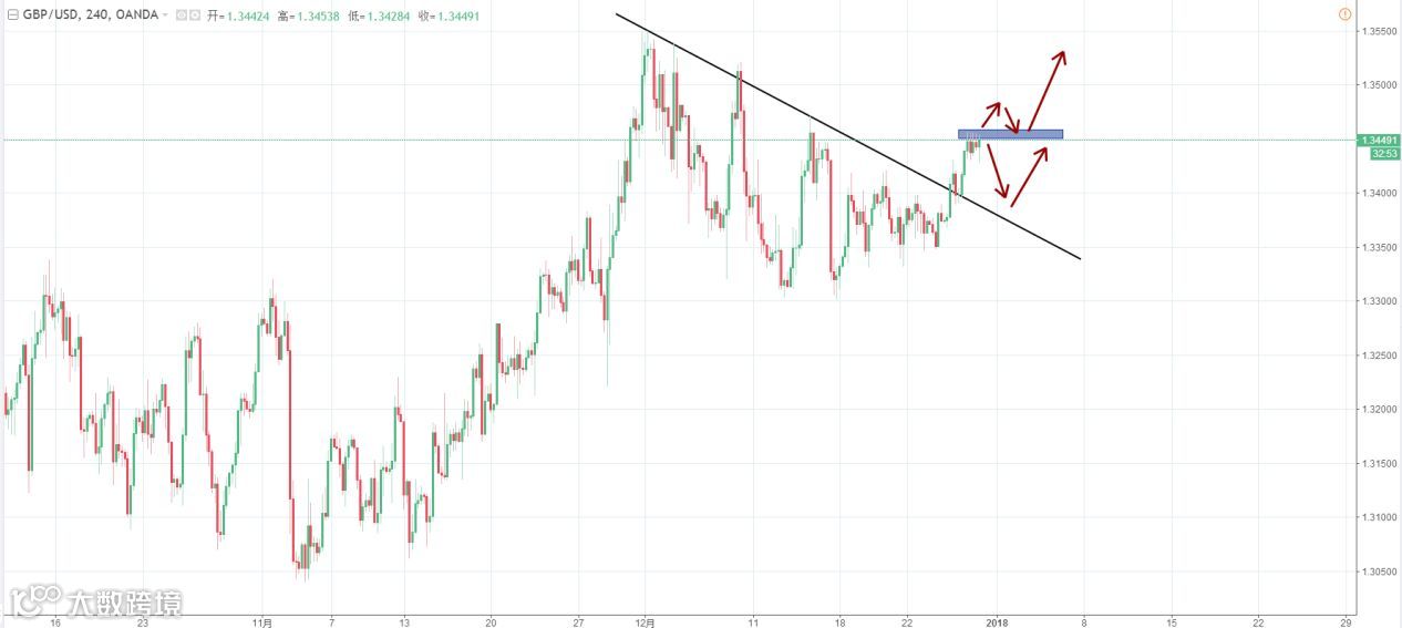 策略:回踩趋势线做多或在1.3455位置附近见明显遇阻信号做空,放小止损,如果突破1.3455位置并企稳可以顺势做多。(谨慎操作,请设置好止损线!)