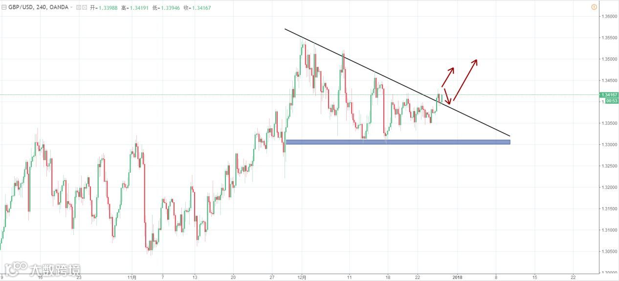 策略分析:英镑兑美元的升值似乎是美元走软导致的结果,在美元指数下滑的背后,没有基本面因素推动,看跌势头可能会有艰难的时间积聚力量。本周余下的时间里,美元走势可能会持续走低,市场投资者普遍保持对英镑兑美元的乐观前景。英国退欧后至今的经济表现以及英央行未来逐步宽松的预期,英镑或仍有升值空间,因此中长线仍宜寻找低多机会。技术上,英镑虽小幅上涨,目前仍处于1.3417-1.333的区间内呈宽幅震荡。从小时图来看,1.3417将被视为是一个有较强压制力的水平位,是否能进一步上涨关键看此位置的压力,四小时三角形收敛已现破位行情,思路做多。
