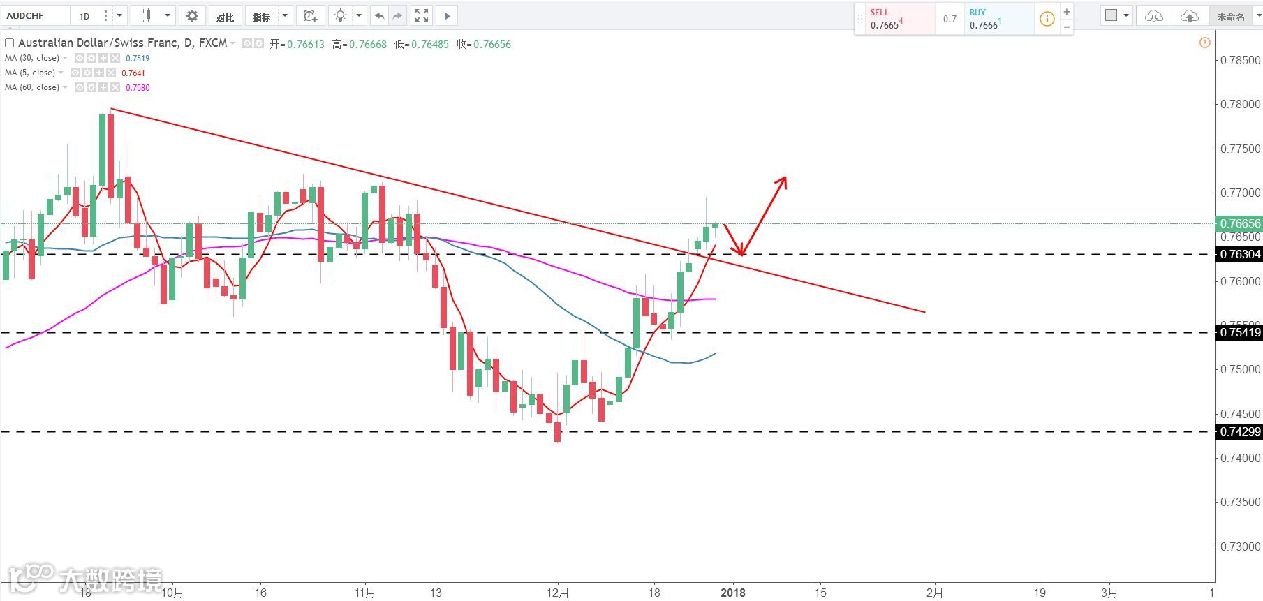 策略:0.7630区域布局多单 止损0.76下方,目标看向0.77。(谨慎操作,请设置好止损线!)