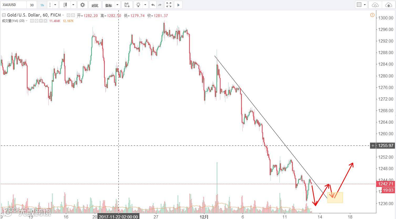 交易策略:4小时三角形整理向下破位,回踩下轨1272附近可做空。1小时下降趋势运行,上轨的压力在1266附近,30分钟在此收出看跌吞没形态做空,止损形态之外加1美金,持仓暂定为3个小时。30分钟下降通道向上突破,不过突破的幅度并不够,等待拉开距离后,回踩出看涨吞没形态做多,止损形态之外加1美金,持仓暂定为3个小时。(谨慎操作,请设置好止损线!)