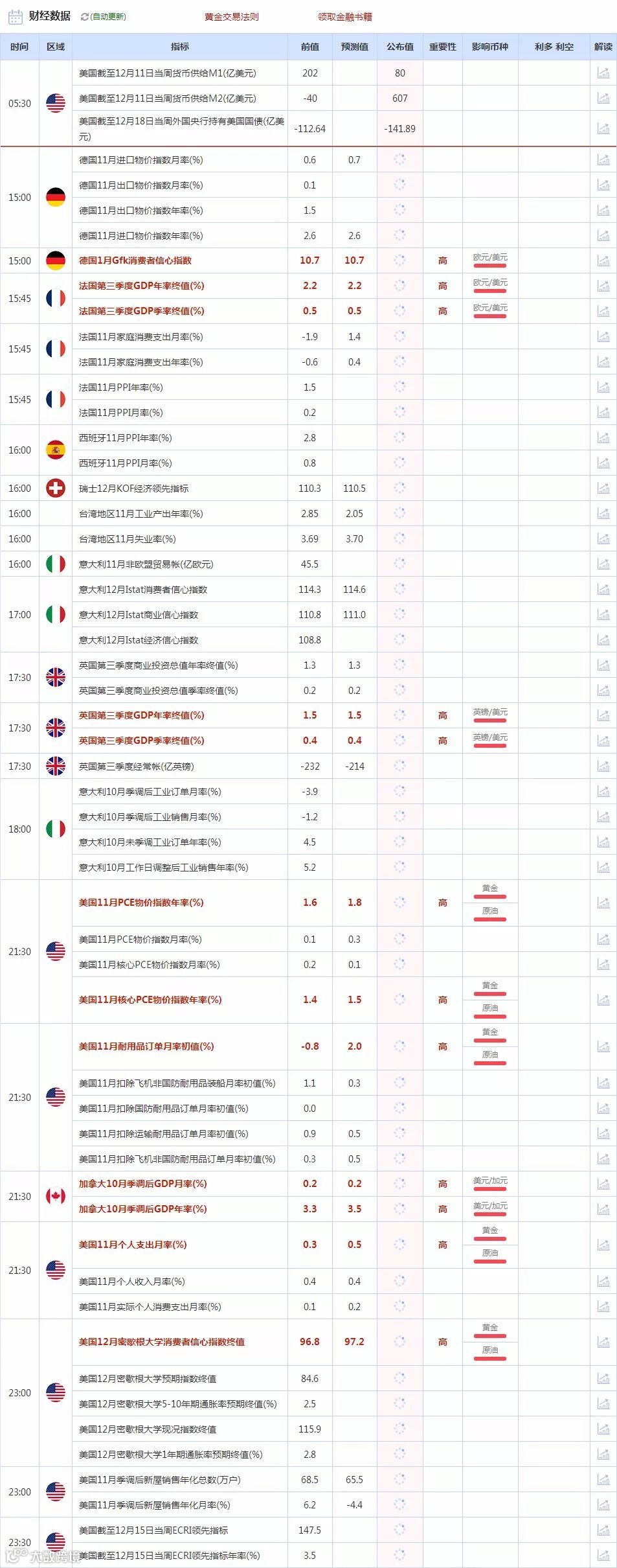 美国时段,投资者需密切关注21:30公布的美国11月PCE物价指数年率、美国11月个人支出月率、及美国11月耐用品订单月率初值。同时公布的加拿大10月季调后GDP月率也值得投资者关注。此外,投资者还需关注23:00公布的美国12月密歇根大学消费者信心指数终值。