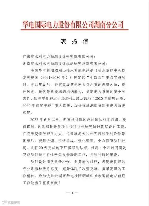12月27日,华电桂阳泗洲山抽水蓄能电站项目业主华电国际电力股份有限公司湖南分公司向我公司发来表扬信。表扬我公司和广东省水利电力勘测设计研究院有限公司科学组织,克服困难,提前完成地下厂房深孔钻探,高效完成预可行性研究报告编制工作,并顺利过审,为加快推进项目前期工作做出了重要贡献。